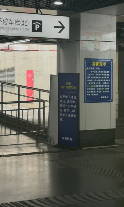 官方资料显示,2024年4月4日起,上海南站实施铁路到达旅客一体化安检方案,后续为优化客流走向,将地铁4号口、5号口调整为只进不出。在前进过程中记者注意到,地铁6号口出站后,地下通道内有多处通向铁路南广场的路口,都有灯箱标识“只出不进”,在停车库指向标附近有一公告,提示出于分流目的,地下通道从去年12月28日起封闭。此处的多个标识导向上海南站南北广场的连接通道,在去年年末地铁3号口扩容升级后,为了便捷地铁换乘,3号口开始实行“只进不出”,通道出于安全考虑关闭。