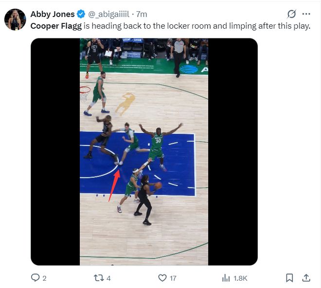 第三节弗拉格打了7分钟,弗拉格在一次追防过程中左脚意外扭伤,随后弗拉格一瘸一拐的走回了更衣室。独行侠记者表示:基德主动叫暂停换下弗拉格,弗拉格的确是一瘸一拐的。