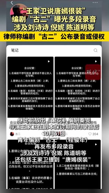 据北青娱见此前报道,10月31日,编剧古二(程某某)再次在社交平台上公布“王家卫秦雯录音”。其中有一段谈到第二天要拍唐嫣的戏,王家卫给古二讲工作安排时说到:“告诉你,唐嫣呢,是个很装的人。”截至目前,当事人对此均尚无回应。而“王家卫说唐嫣很装”“古二爆料刘诗诗倪妮流金岁月内幕”“王家卫说陈道明是极品”等话题词条纷纷冲上热搜。