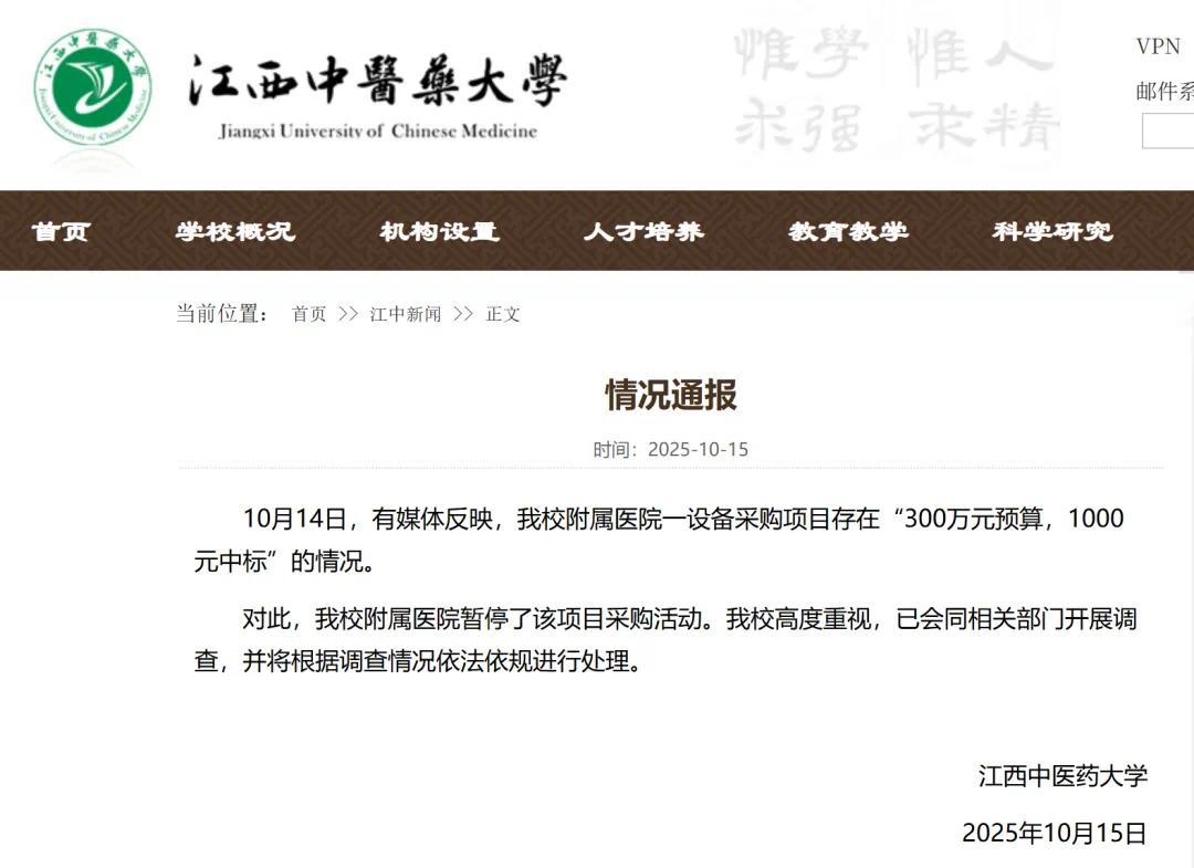 10月14日,有媒体反映,我校附属医院一设备采购项目存在“300万元预算,1000元中标”的情况。
