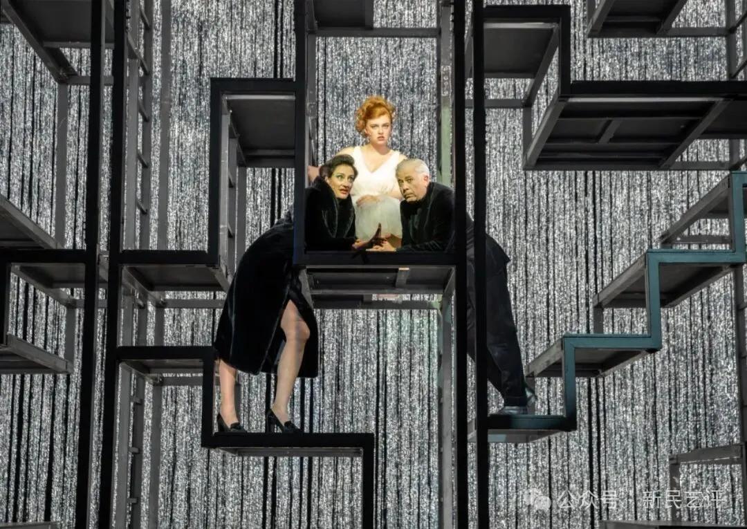 舞台的深处,几盏裸露的灯光透过高耸入顶的脚手架,如探照灯般直射观众;光线在钢架结构的阴影间闪烁。而在这些巨大的冰冷的工业钢结构前,轻盈如羽毛,廉价的迪斯科彩带正反射出诱人璀璨的光芒,让我们看到人物或者事实的支离破碎。飘逸缠身的丝带如流光,巨大冰冷的钢结构似桎梏,极大的视觉冲突,当演员的血肉之驱在其间穿梭,上下攀爬,仿佛困兽在牢笼中做着最后的挣扎和狂欢。西岸大剧院昨晚的这一版,由德国布莱希特剧团带来的《三分钱歌剧》的舞台设计,以极简却犀利的视觉语言,直抵布莱希特戏剧的核心,现代人在流光溢彩的囚笼中的思想和生存困境。每个人都在表演,而真相如彩带的反射,只有碎片,永远无法完整呈现。