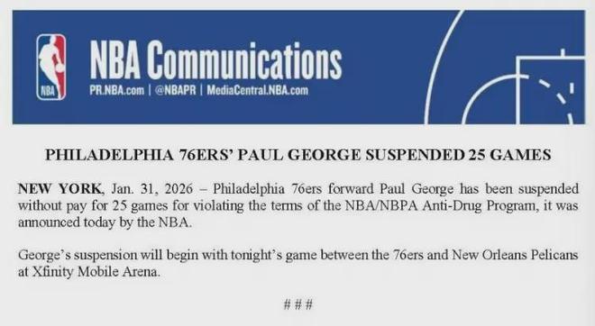 爆料王Shams:乔治因违反联盟禁药政策将被禁赛25场比赛......该消息已经得到NBA官方的确认。
