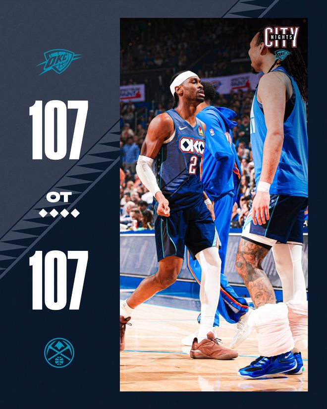 雷霆队的亚历山大得到36分和9次助攻,霍姆格伦得到15分和21个篮板,麦卡恩得到14分,卡鲁索得到12分,杰林-威廉姆斯得到12分和5个篮板,华莱士得到10分和4个篮板,哈滕得到9分、8个篮板和5次助攻。掘金队的穆雷得到39分、8个篮板和6次助攻,布劳恩得到23分和7个篮板,约基奇得到三双23分、17个篮板和14次助攻,哈达威得到16分。
