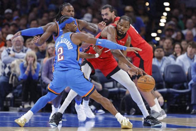 三分球是一个绕不开的原因,尽管本赛季火箭三分命中率高居联盟第7位,但三分命中数和三次出手分别排联盟第25位和29位。更惨的是火箭场均命中的11.3个三分中有一半集中在杜兰特、谢泼德和史密斯三人身上。五大首发除了杜兰特再也找不到一个稳定三分点。这也是为什么其他球队敢疯狂包夹杜兰特,因为其他人真投不进三分也不爱投三分。战雷霆火箭三分命中率不到三成,整场比赛杜兰特不是火烧中的驴肉,就是被窝里都是多尔特。死神自身投篮命中率只有30.4%自然扛不起输出重任。