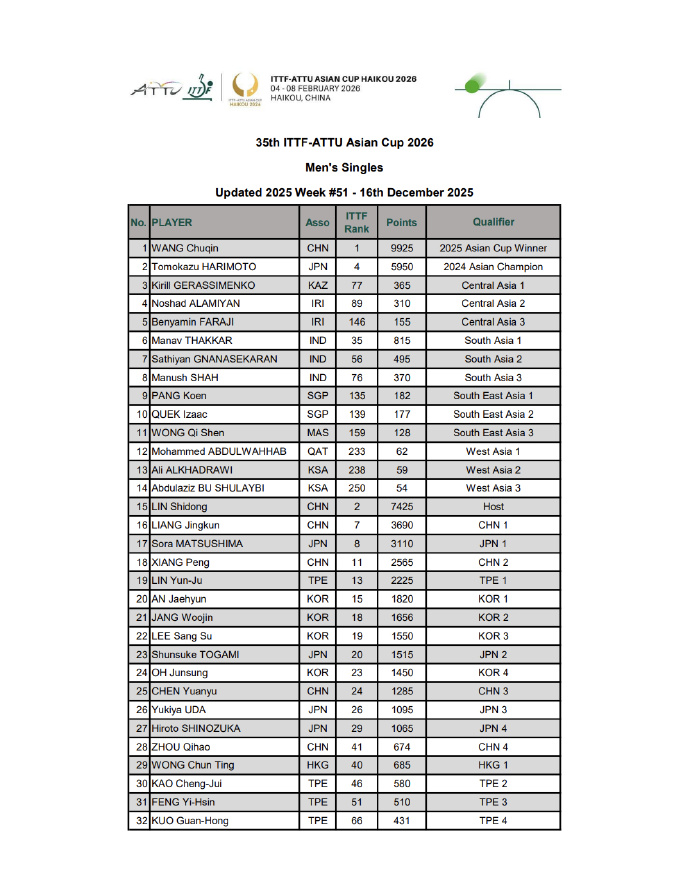 第35届国际乒联-亚乒联盟亚洲杯,将在2026年2月4日-8日进行,地点在海南海口市进行,属于明年一项比较重要的赛事,尤其是赛事改革、人数增多之后,加上设置奖金,提升积分,使得各协会更加重视,今年的亚洲杯就聚集了亚洲各大高手参赛,国乒也是全主力出战。