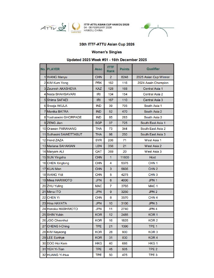 原本根据规定每个协会最多只有男女单各4名入围,不过有三项除外,今年获得亚洲杯男女单冠军将自动获得参赛资格,王曼昱和王楚钦获得, 不占用国乒名额。