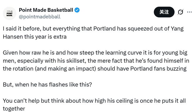 美媒Point Made Basketball写道:“我之前就说过,开拓者今年能从杨瀚森身上挖掘出这么多价值,已经算是意外之喜了。考虑到他尚且稚嫩的技术功底,以及年轻内线球员本就陡峭的成长曲线 —— 尤其是结合他的技术特点来看 —— 他未来不仅能稳稳进入球队轮换阵容,还能打出实实在在的影响力,单是这一点就足以让开拓者的球迷们兴奋不已了。可要是看到他打出这样灵光乍现的表现呢?你就会忍不住去畅想,一旦他把所有技术能力融会贯通,未来的上限究竟能有多高。”