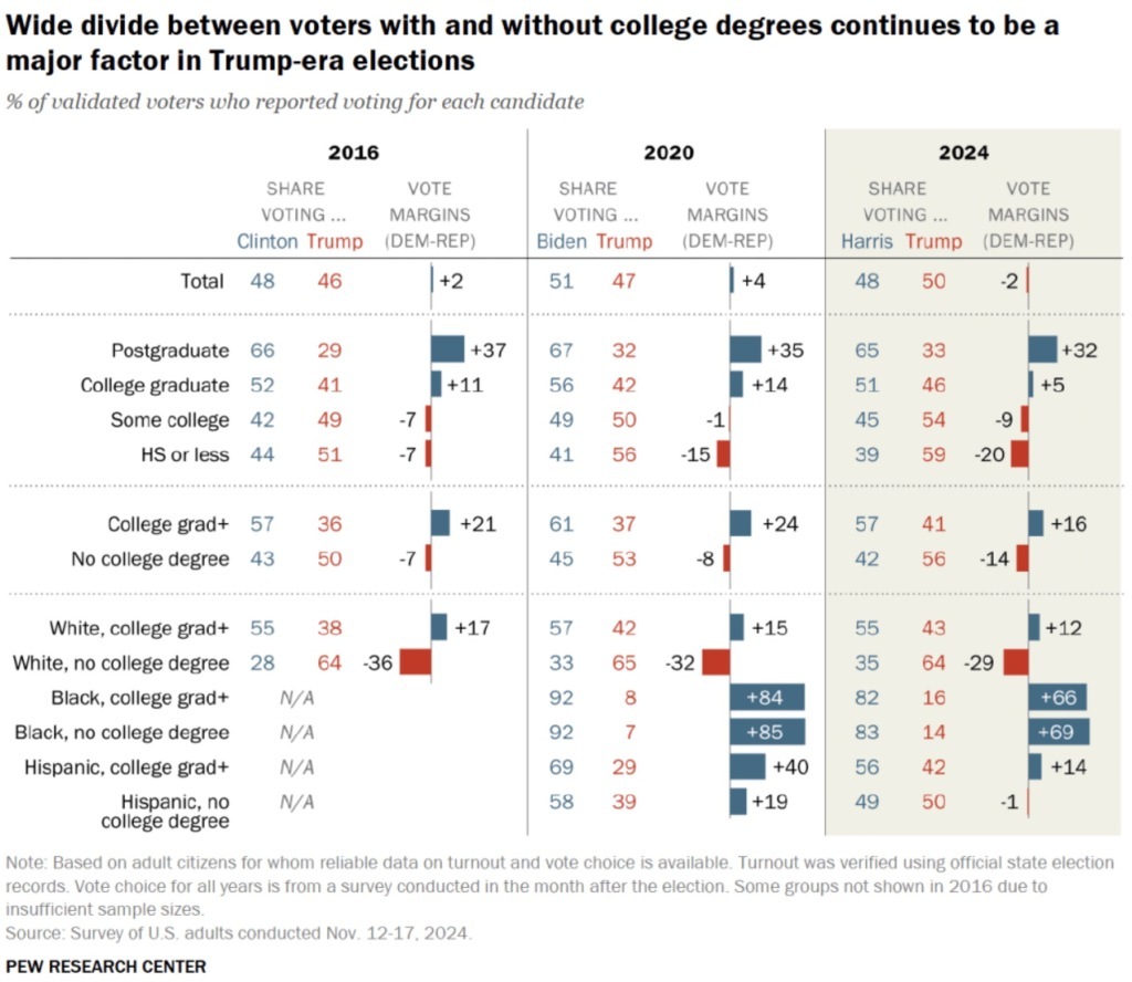 图:2016、2020、2024年美国总统选举中,受教育程度不同的群体对两党的支持率(来源:Pew Research Center)