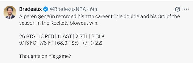 休媒晒出申京此役的数据,盛赞此役他拿到了怪物一般的三双数据。本赛季申京场均6.3助攻实际是火箭的第一组织进攻点,他继续朝着约基奇的方向进发。