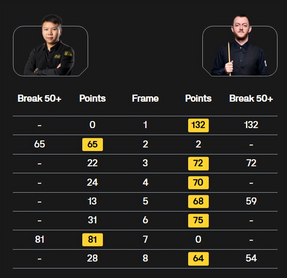 周跃龙抓住机会,单杆得到53分,这一局没有再给马克-艾伦任何机会,73-13赢下第15局,在3-7落后的情况下,强势来了一个五连鞭,周跃龙8-7率先拿到赛点!