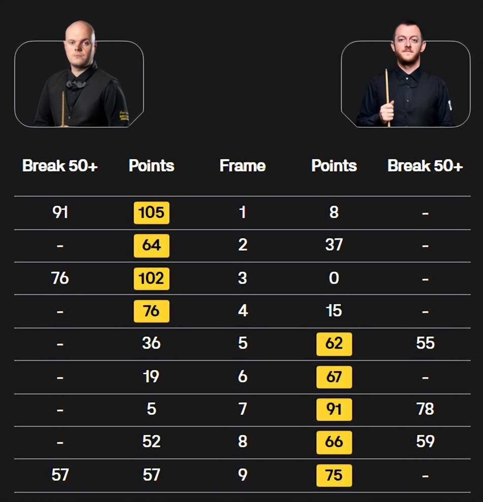 周跃龙防守出现失误,马克-艾伦把握住机会,单杆得到71分,台面还剩5颗红球(最多67分),马克-艾伦已经实现超分,不过马克-艾伦运气不佳,母球意外摔袋被罚4分,马克-艾伦71-4领先67分,此时台面最多正好剩67分。