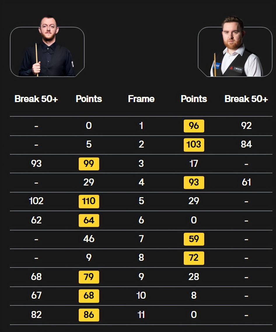 不过来到决赛第二阶段,周跃龙调整了状态奋起直追,回击马克-艾伦一个5-1,顽强的大比分追至7-7平!17局9胜制变成了3局2胜制,下面带来二人第15局之后的详细比赛信息。