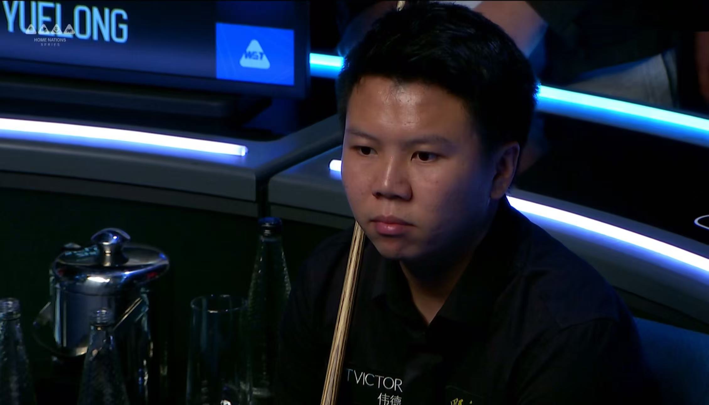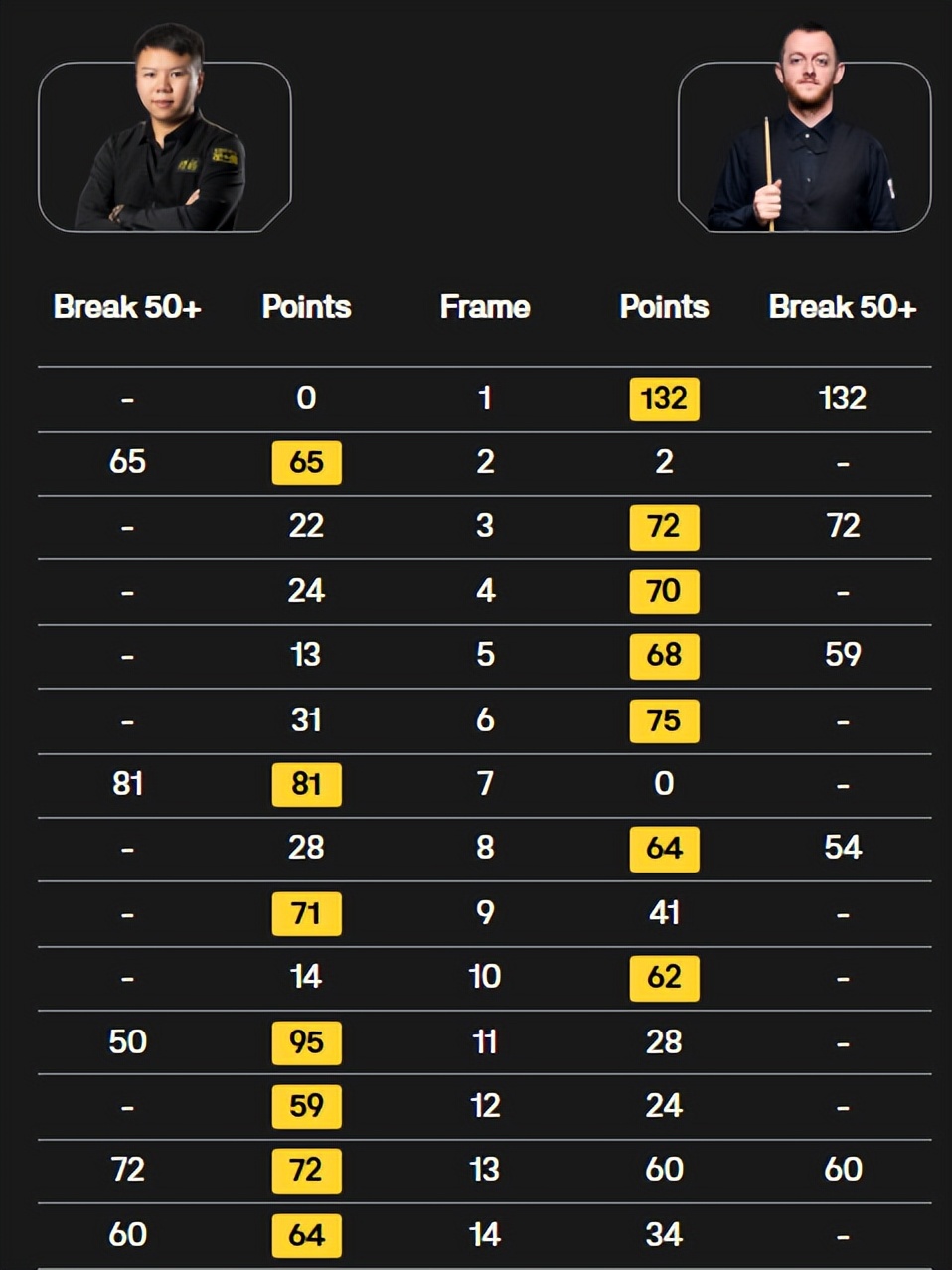 马克-艾伦想紧贴红球,结果力量小了没有碰到红球被罚4分,同时周跃龙获得了很好的上手机会,不过单杆仅得到16分,击打黑球出现了失误,之后双方进入防守模式。