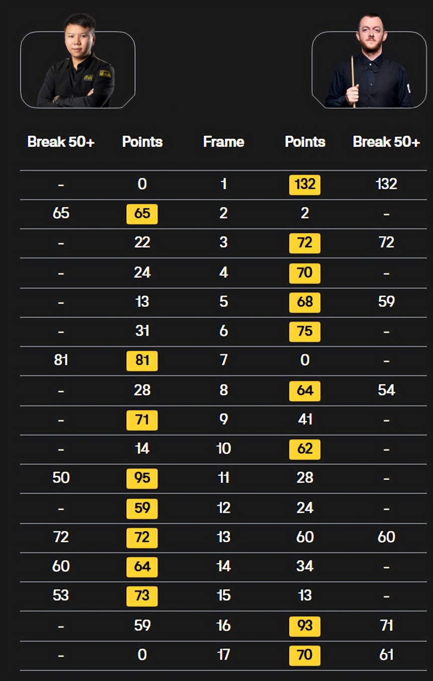 不过周跃龙运气不佳,母球意外摔袋被罚4分,同时马克-艾伦获得自由球,93-59赢下了第16局,双方大比分战至8-8平,进入决胜局较量!