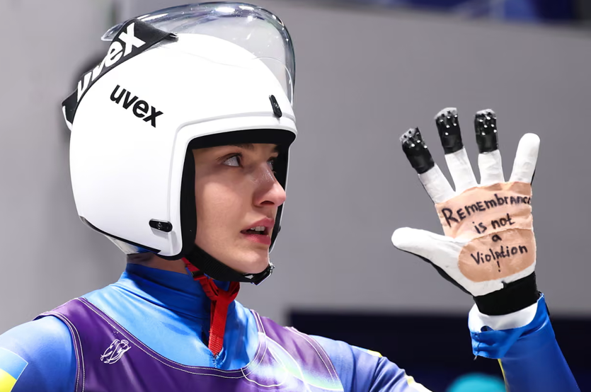 乌克兰无舵雪橇选手奥琳娜·斯玛哈(比赛现场):她面对镜头,展示着自己的手套,上面写着四个字:“记忆并不违规。”