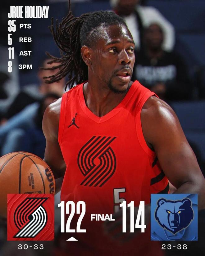 这场比赛,开拓者后卫霍勒迪打出了本赛季个人最强一战:全场出战32分钟,投篮19中13,三分11中8,罚球1中1,得到35分5篮板11助攻。