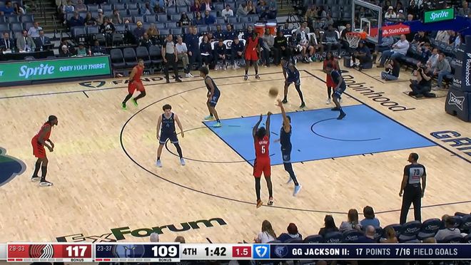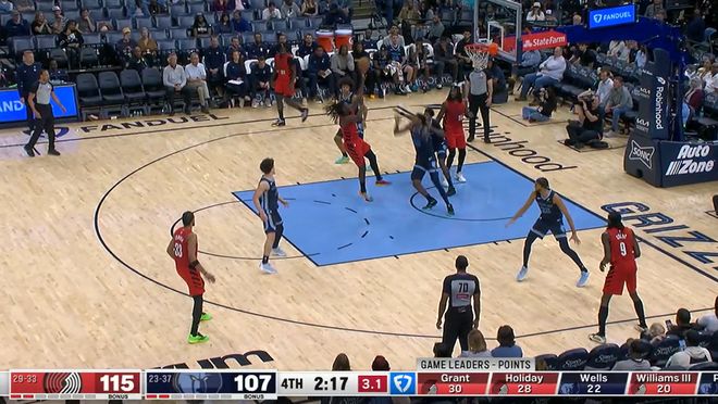 比赛剩下2分钟前,开拓者只领先8分,正是霍勒迪,先一记抛投、再一记三分,帮助开拓者将分差拉大到两位数。