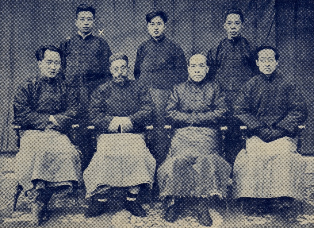 前排左起:李济、王国维、梁启超、赵元任,后排左起:章昭煌、赵万里、梁廷灿(1925年12月10日)