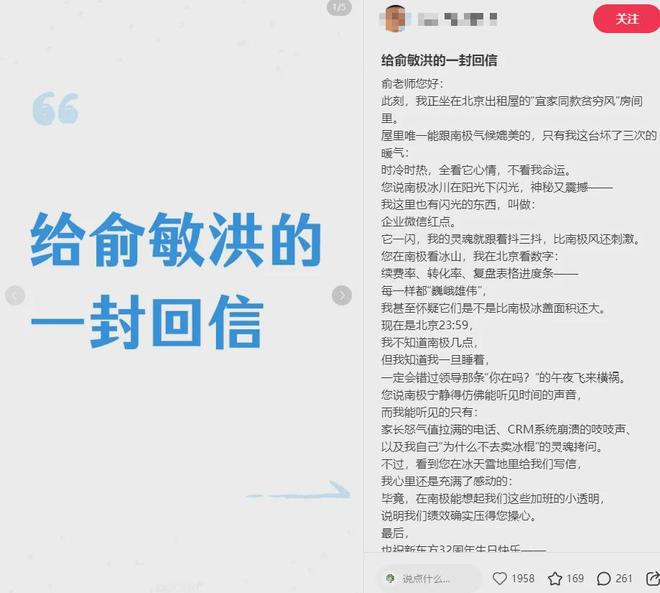 有网友统计,内部信全文提及17次“我”和5次“南极”,却对员工当下的工作压力鲜有提及。一名网友发布“给俞敏洪的一封回信”,称“您在南极看冰山,我在出租屋看数字。”