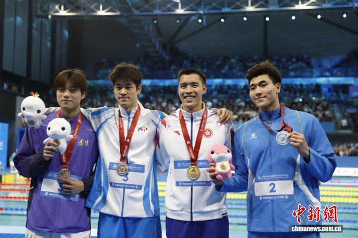 11月16日晚,在第十五届全运会男子50米自由泳决赛中,香港队何甄陶夺得冠军。图为获奖选手合影。 中新社记者 韩海丹 摄