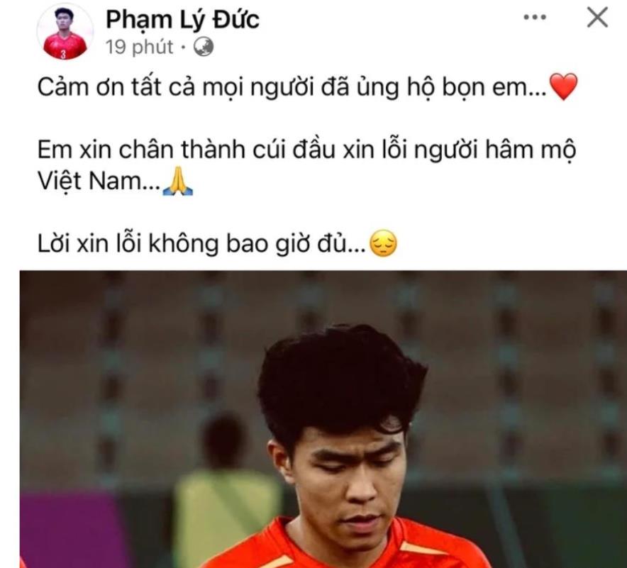 越南队后卫范理德在比赛中拳击拜合拉木吃到红牌,赛后他发布社媒向越南球迷致歉。