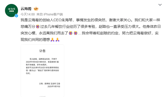 在9月19日下午2点前后,云海肴联合创始人、CEO朱海琴也发文悼念:“我们和大家一样悲痛万分……我会带着和赵晗的约定,努力把云海肴做好,实现我们共同的理想。“