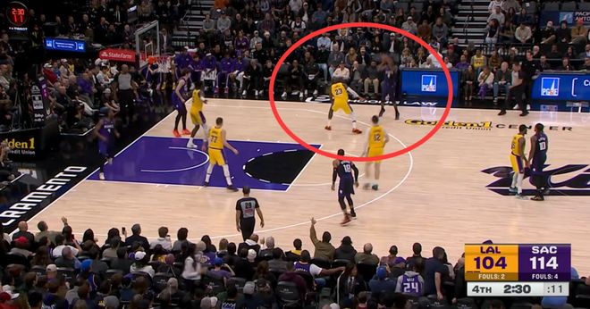 詹姆斯最后五分钟被换上场,他替换下去的是范德比尔特,而当时本来双方的分差是12分,本来湖人还有机会,结果詹姆斯上来之后一己之力送掉了比赛。首先詹皇上场之后一分没拿,也没有任何的正面数据贡献,甚至连一个助攻都没有送出来,那他上来之后到底干了些什么呢?他用一攻一防直接坑死了洛杉矶湖人。
