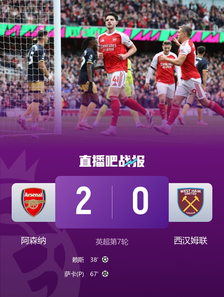 赖斯破旧主+伤退,萨卡英超200场里程碑建功,枪手先赛1分优势暂登英超榜首。