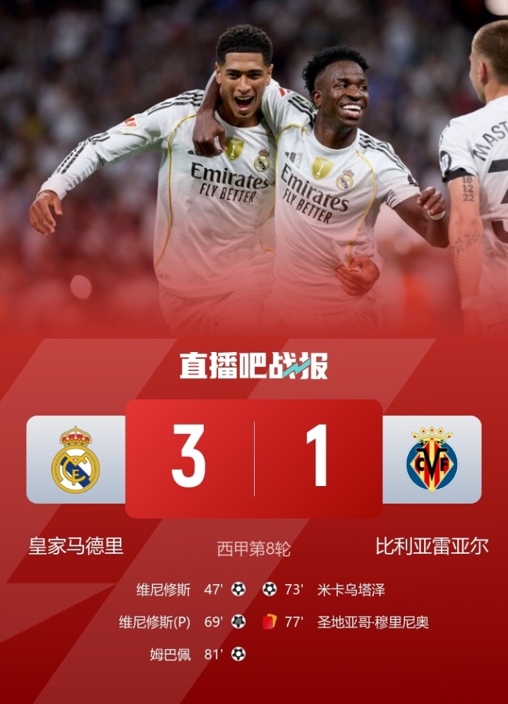 皇马先赛暂2分优势登顶,维尼修斯双响,姆巴佩传射+让点伤退。