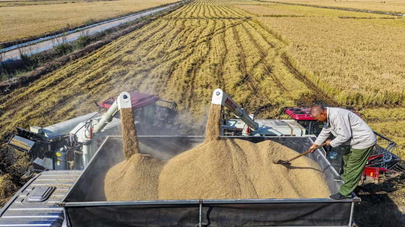 10月27日,河北省唐山市海港经济开发区王滩镇农民将收获的稻谷装车,准备运出稻田晾晒。农业农村部最新农情调度显示,目前,全国秋粮主产区收获已超八成半。 新华社发(刘满仓 摄)