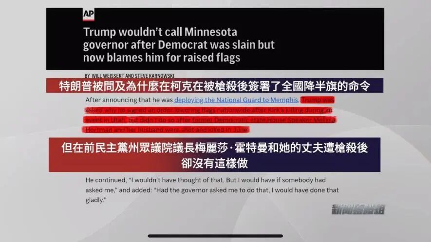 当地时间9月16日,在白宫的一次发布会中,有记者向特朗普提问:“为什么在柯克被杀后他签署了降半旗的命令,但在前民主党州众议院议长梅丽莎·霍特曼和她的丈夫被枪杀后却没有这样做?”