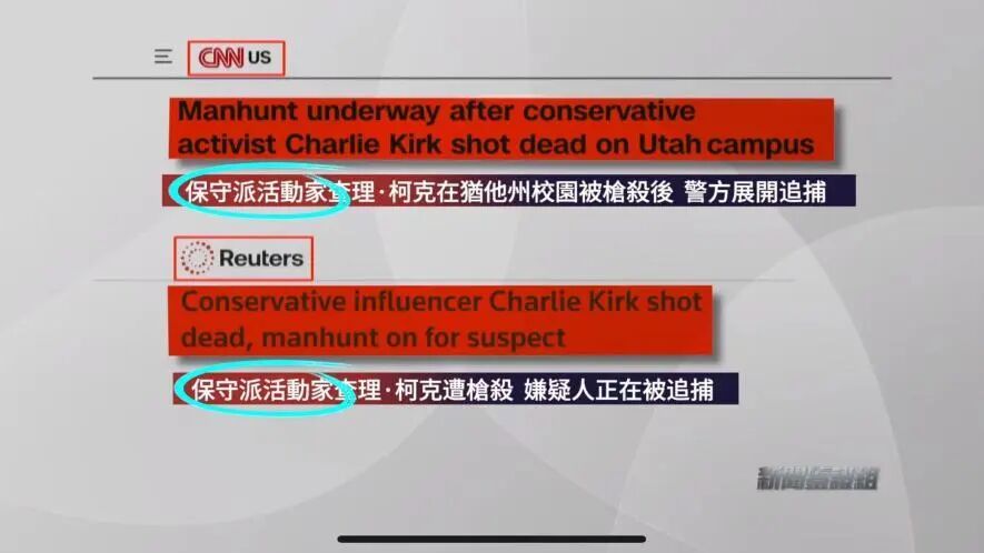 CNN及路透社在报道查理·柯克遇刺事件时候,都在他的身份前面加了这样一个词:美国保守派活动家。美国商业新闻频道CNBC和BBC在报道时,也增加了一个定语,说他是“特朗普的盟友”。