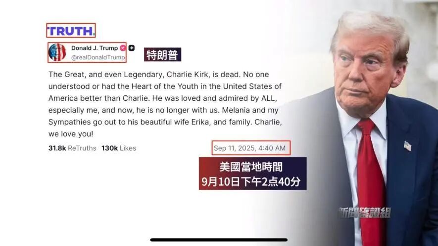 刺杀事件发生当日(9月10日)下午2点40分,特朗普在社交账号宣布:“柯克已经身亡”。