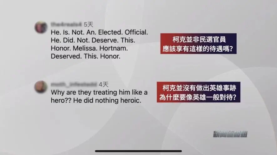 有网友对此发表评论时说:柯克并非民选官员,应该享有这样的待遇吗?柯克并没有做出英雄事迹,为什么要像英雄一般对待?