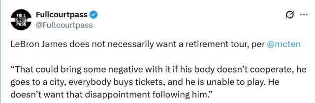 北京时间1月29日,据湖人记者Dave报道,詹姆斯并非一定要举办退役巡演。另外,骑士愿意促成詹姆斯第三次加盟球队,但也受到诸多因素的影响。