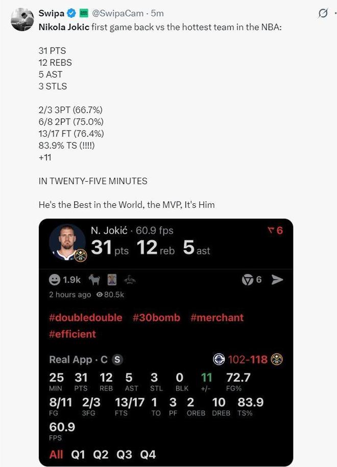 他出战不到25分钟便贡献了31分和12个篮板,这样的效率直接改变了掘金的进攻层次,也迫使快船队的防守顾此失彼。