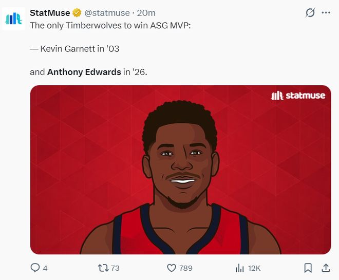 根据数据媒体StatMuse的报道,爱德华兹拿到2026年AMVP是森林狼队史2003年的凯文-加内特后首人。