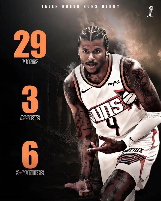 需要说的是,杰伦格林的首秀其实非常惊艳,当时太阳115-102战胜快船,杰伦格林全场只打了23分钟时间,投篮20中10,三分13中6,罚球5中3,拿下29分3篮板3助攻2抢断,正负值高达+30。