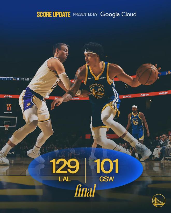 湖人第三节再砍34分,前三节得分均在32分以上。三节战罢,湖人99-72领先勇士27分。第四节追梦连砍5分,但是对比赛已经没有任何影响,分差一直在30分左右。最后7分多钟,两队换上替补。全场结束,湖人129-101大胜勇士。