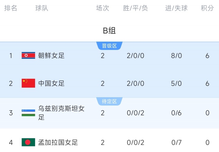 小组赛前两轮,中国女足和朝鲜女足均是两连胜且0失球。中国女足的FIFA排名为第17,朝鲜女足为第9。