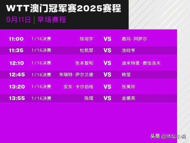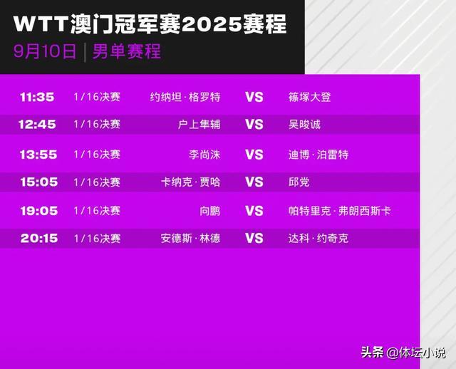 北京时间9月10日,WTT澳门冠军赛第二个比赛日继续进行,根据最新的赛程安排,男女单打的16强继续产出,不知道会不会爆冷,而国乒5人出战迎来5场外战,引发巨大的关注,目标冲击5连胜,其中国乒世界排名第一的孙颖莎迎来首秀,小将向鹏挑战弗朗西斯卡压力山大!