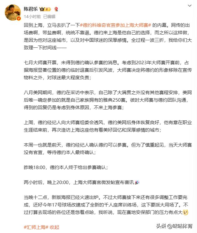 9月24日,网球媒体人陈君乐在社媒上透露了德约科维奇参加上海大师赛的内幕,据他了解,德约参加上海大师赛完全是个人选择,与出场费和代言费毫无关联;之所以这样做,纯粹是出于他对上海,以及对中国球迷的深厚感情。