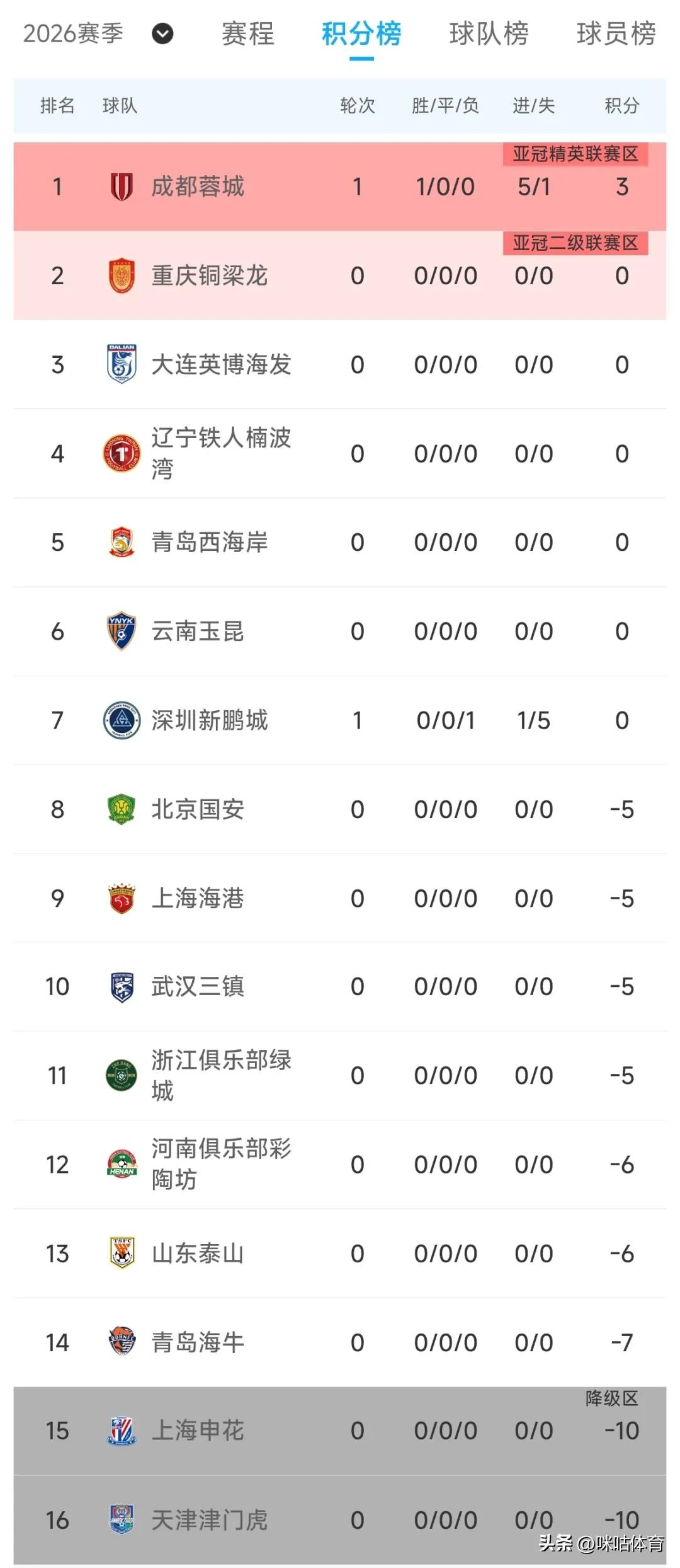 揭幕战过后的中超积分榜: