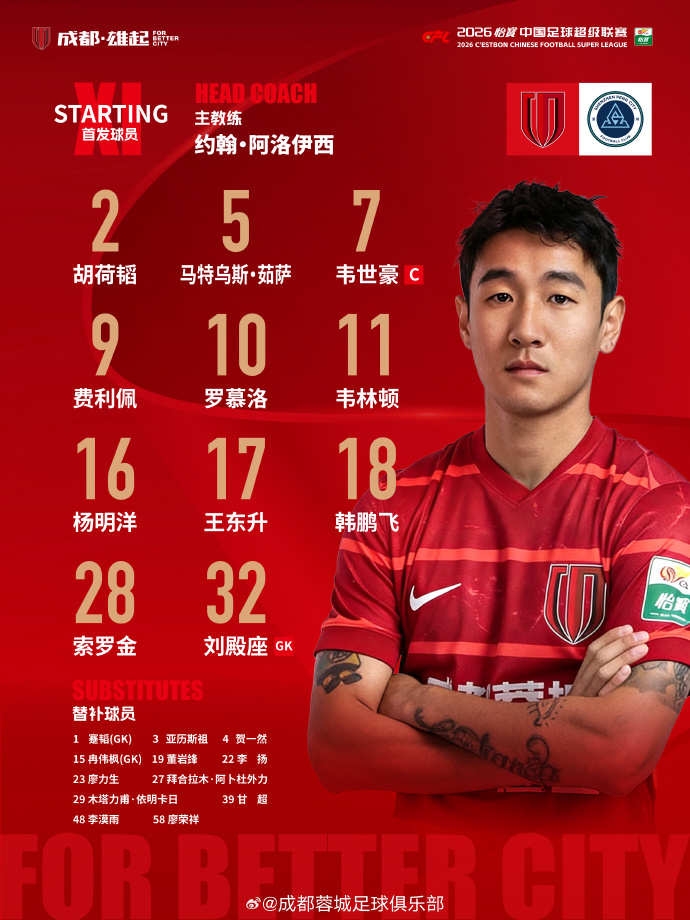 3月6日19点35分,2026赛季中超联赛揭幕战在凤凰山体育场进行,上赛季季军成都蓉城主场对阵深圳新鹏城。比赛中,阿代米第5分钟闪击破门,打进本赛季中超联赛首球,姜至鹏肘击染红,新鹏城在1球领先的情况下被迫以10人应战。随后,韦林顿-席尔瓦、费利佩、胡荷韬在上半场连入三球,韦林顿下半场打进个人第二球,廖荣祥替补建功。最终,成都蓉城主场5-1逆转大胜深圳新鹏城,取得开门红。
