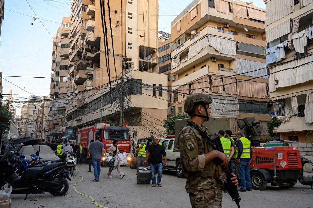 当地时间2025年11月23日,黎巴嫩贝鲁特,真主党成员和黎巴嫩军队士兵在一次致命的以色列空袭后清理公寓楼废墟,人们携带行李离开。视觉中国 图