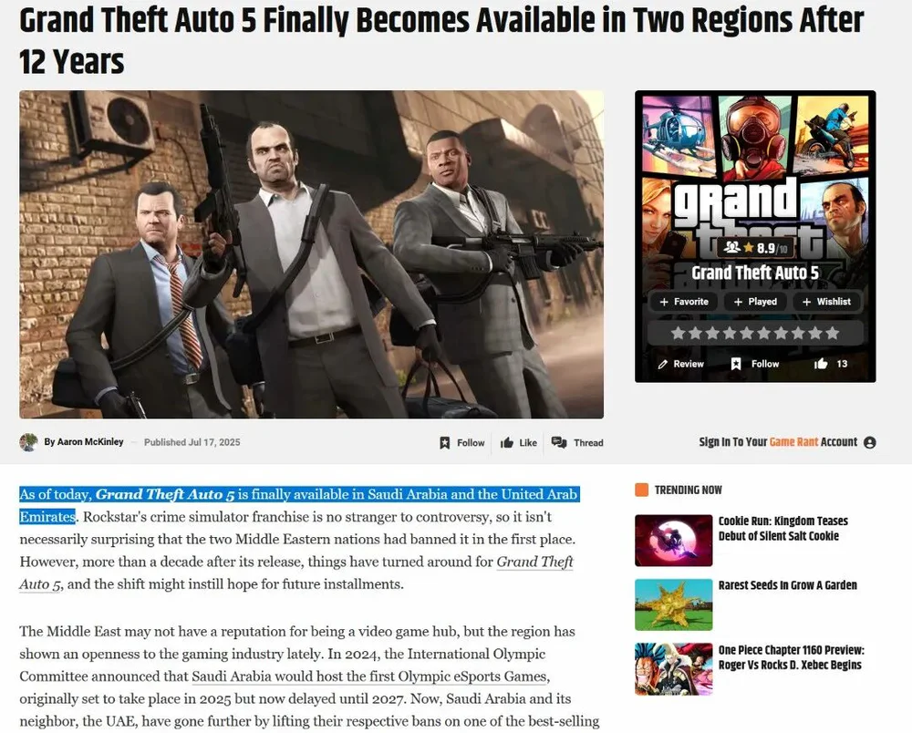 今年7月,在被禁12年后,GTA5终于在沙特和阿联酋被解禁了