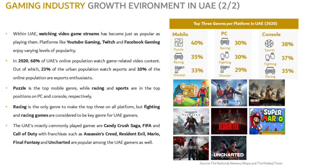 无独有偶,同样热心于游戏产业的阿联酋也一样具有着类似的环境。其国内市场不仅对于传统“枪车球”类游戏有着不低兴趣,而且喜好的游戏类型也与市面上大家所畅玩的游戏类型是一致的,消费能力上也日益增长,玩家也越来越愿意在游戏中进行消费。