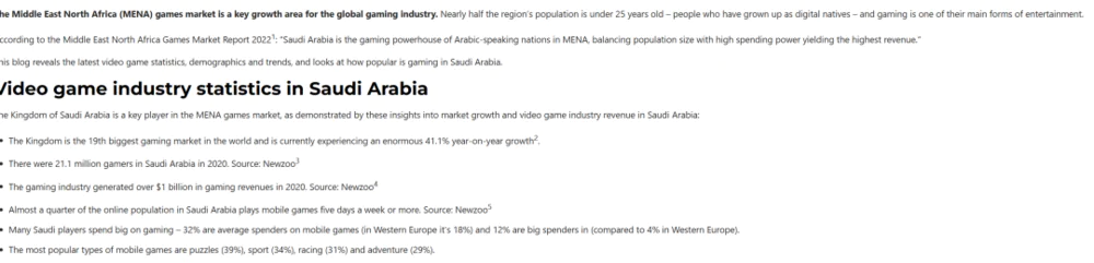 根据《2022年中东和北非市场游戏报告》的内容显示,沙特目前是全球第19大游戏市场,且年增长率高达41.1%,游戏玩家数更是增长到了2110万人,其游戏产业更是创造了超过10亿美元的收入。