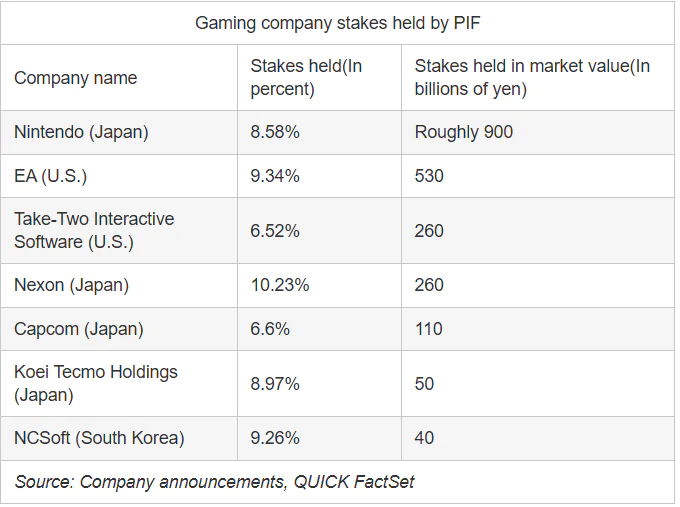根据日本《产经新闻》于2024年9月的一份报道所示,在那时候PIF已经拥有了世界上众多著名游戏公司的股份,且股份程度也具备一定规模: