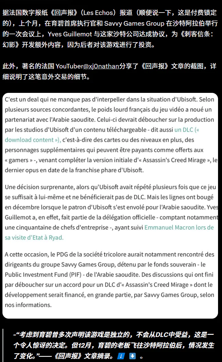 根据法国数字报纸《Les Echos》所报道,育碧首席执行官就与Savvy在24年12月于沙特进行过的一场会议,最终双方达成了协议,并形成了如今的《刺客信条:幻景》新DLC,这大抵是Savvy直接全包了费用,育碧只要做好游戏内容(并免费送给所有玩家),好好宣传下阿拉伯世界就行。